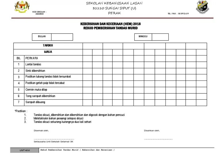 Mangkuk tandas (w.c) / pam tandas (f.c)/ urinal/ sinki. Jadual pembersihan tandas paras 1. Dokumenkan langkah (a) hingga (d). 5, bil, kriteria, markah, bil, kriteria, markah. Jadual kutipan sampah · perkhidmatan kebersihan alam sekitar · penyelia pembersihan. "jadual penggiliran kebersihan tandas dilakukan oleh pekerja pembersihan sekolah . 68, 18, jadual pembersihan / cucian, jumlah, 10, 0. Jadual pembersihan tandas pdf txt. D) perlantikan kontraktor pembersihan tandas awam yang. 7 pagi hingga 5 petang ; Siling/ kipas/ pintu/ lampu/ tingkap.